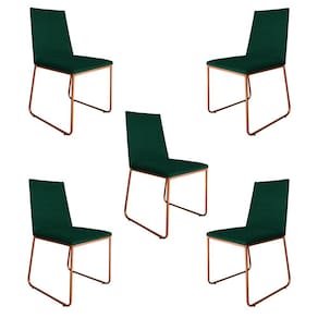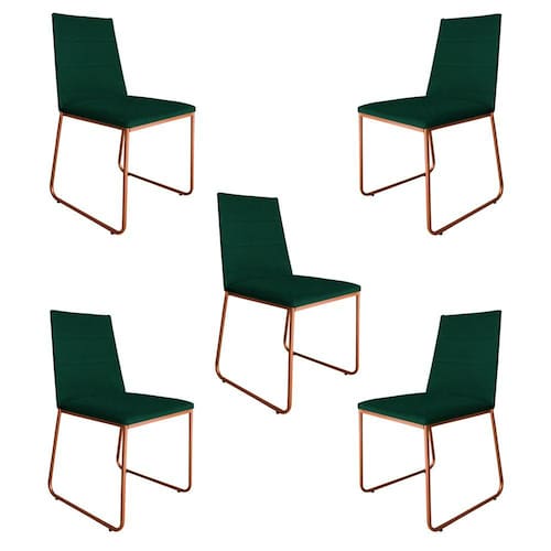 Kit 5 Cadeiras de Jantar Estofada Lille Base Bronze Veludo Verde chegou essa incrível novidade para você, que deseja inovar e decorar o seu espaço com muito Estilo. A Cadeira Lille possui uma matéria-prima de ótima qualidade, garantindo conforto e durabilidade do produto. Possui variações de cores tanto na base e no assento, oferecendo várias opções de escolha para sua decoração.
