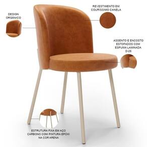 Altura da cadeira: 80 cm | Altura do assento a partir do solo: 46 cm | Color: Laranja | ColorFamily: Laranja | ColorSimple: Canela | ColorSupplier: Canela | Cor: Canela | Cor da estrutura da cadeira: Arena | Cor do assento: Canela | Cor do estofamento: Canela | Desenho do tecido: Liso | É cadeira de balanço: Não | É dobrável: Não | É empilhável: Não | Espessura do assento: na | Fabricante: Lyam Decor | Firmeza: Firmeza | Largura da cadeira: 44 cm | Largura do assento: 42 cm | Material: Estrutura em Aço carbono, Revestimento em Couríssimo e espuma | Material do estofamento: Couríssimo e espuma | MaterialFamily: Aço carbono, couro sintético e espuma | Model: Gavi | OriginCountry: Nacional | OriginState: PR | Peso máximo suportado: 120 kg | ProductContents: 05 Cadeiras | ProductHeight: 81 cm | ProductInstructions: Produto para uso em ambiente interno, nao devendo ficar exposto ao sol, calor e umidade excessivos. | ProductLength: 53 cm | ProductWarranty: 90 dias após o recebimento do produto | ProductWeight: 25 kg | ProductWidth: 44 cm | Profundidade da cadeira: 53 cm | Profundidade do assento: 42 cm | Requer montagem: Não | SizeDescription: Altura: 81 cm x Largura: 44 cm x Profundidade: 53 cm | SupplierSimpleName: Kit 5 Cadeiras Sala de Jantar Estofada Gavi Arena L02 Couríssimo Canela - Lyam Decor | Tempo de montagem: na