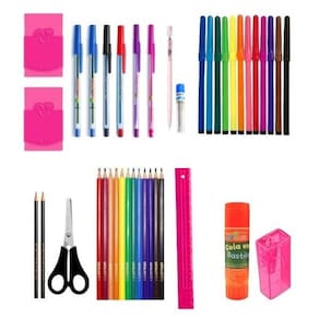 06 canetas esferográficas 01 cola 01 apontador 02 lápis preto 01 tesoura 02 borrachas 12 canetinhas 01 régua 30cm 12 lápis de cor 01 lapiseira 01 grafite