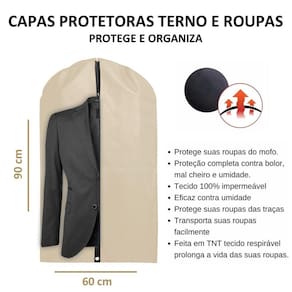 Capa protetora com zíper e material resistente, perfeita para proteger e conservar suas roupas. Mantenha suas roupas sempre protegidas.- Com este nosso produto, você evita a umidade que produz o mofo e ao mesmo tempo protege suas roupas da poeira.- Guarda roupas ou closet mais organizados, sem que as roupas enrosquem entre si e evitando futuros problemas.- Material em TNT com Gramatura de 60.- Dimensões: 60 cm de largura x 90 cm de altura.- Cor: Bege Clean. Especificações Capa toda em TNT:- Confeccionado em TNT, Zíper de Nylon e Cursor Niquelado.- Possui Zíper em toda a altura facilitando a colocação dentro da capa.- Dimensões: 60cm de Largura x 90cm de Altura.- Tecido impermeável protege da umidade, bolor e bactérias.Conteúdo: 5 Capa Protetora com Ziper