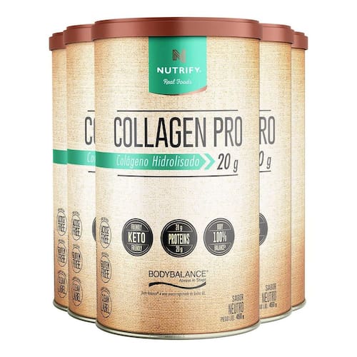 Kit 5 collagen pro colágeno hidrolisado neutro nutrify 450g Benefícios: fortalecimento da pele, unhas e cabelos. A produção de colágeno pelo organismo diminui progressivamente ao longo dos anos, ocasionando flacidez e outros sinais de envelhecimento. De fácil digestibilidade e ótima absorção, collagen pro nutrify é formulado com os peptídeos bioativos de colágeno body balance, matéria-prima de alta pureza e tecnologia. Collagen pro nutrify tem sabor delicado de chá, podendo ser ingerido gelado e quente ou adicionado a smoothies e frutas, sendo uma excelente forma de aumentar a ingestão de proteína. Nutrify valoriza a origem de cada ingrediente, respeita a integridade de suas fontes naturais e dos envolvidos em sua produção. É assim que criamos produtos saudáveis e saborosos, que fazem bem para as pessoas e para o planeta. Acreditamos que nutrir corpo e mente de modo saudável nos torna capazes de alimentar o mundo com atitudes positivas. Ingredientes: colágeno hidrolisado body balance . Não contém glúten. Este produto não é um . Não exceder a recomendação diária de consumo indicada na embalagem. Mantenha fora do alcance de crianças. Este produto é recomendado para adultos a partir de 19 anos Apresentação: embalagem disponível: lata contendo suplemento em pó. Sabor neutro. Peso líquido: 450 g produto classificado como: suplemento alimentar em pó sabor neutro. Marca: Não Informado