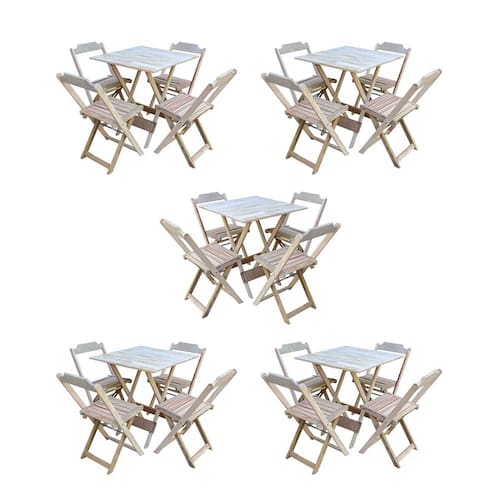 Kit 5 Conjuntos De Mesa Dobravel Com 4 Cadeiras De Madeira 70x70 Para Restaurante E Bar - Sem Pintura O produto é ideal para bares, restaurantes, estabelecimentos, áreas de lazer e também para sua casa. Feito em madeira maciça, tornando resistentes e duráveis. Seu design permite que seja encaixado em qualquer ambiente, trazendo um toque a mais para seu estabelecimento. Além de sua durabilidade, o que lhe trará conforto para servir seus clientes. Por ser dobrável torna-se mais fácil guardar, manusear e limpar o produto.