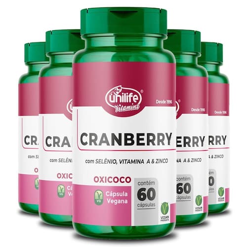 Kit 5 Cranberry 60 cápsulas Unilife O que é o Cranberry da Unilife Cranberry da Unilife como o próprio nome já diz é um produto que tem o fruto cranberry em sua composição, mas além do cranberry possui selênio, vitamina A e zinco, fornecendo diversos benefícios a saúde, entre eles encontramos seu grande potencial de diversas vitaminas proporcionando melhor funcionamento para todo o organismo e o corpo, consumindo o Cranberry da Unilife você pode manter uma ótima qualidade de vida ao sistema imunológico enquanto pode obter , isso ocorre devido aos seus diversos componentes que juntos podem fornecer muitos atrativos. Cranberry é um antioxidante Sim, sua principal finalidade é a ação antioxidante, portanto como o produto da Unilife não possui somente o cranberry em sua composição ele pode fazer um efeito muito além de apenas a limpeza do organismo, juntos todos componentes fazem a manutenção completa do corpo, tornando ele mais forte com relação a imunidade e prevenção de doenças, ou seja o consumo do cranberry da Unilife pode sim ser como um super antioxidante pois além de ações antioxidantes possuem muitos benefícios extras. Propriedades do Cranberry, Selênio, Vitamina A e Zinco. Cranberry: A fruta possui 3 vezes mais vitamina c do que a laranja o que pode proporcionar um fortalecimento enorme para o sistema imunológico, as vitaminas A, E e K também estão presentes na fruta porem suas proporções não tão abundantes igual a vitamina C, alem disso a fruta possui ferro, cálcio, potássio, e fosforo, todos agem de forma coletiva e benéfica ao nosso organismo. Selênio: É um elemento muito difícil de ser encontrado em alimentos convencionais, que o corpo necessita de poucas quantidades dele mas não faz a produção somente pelo organismo, ele tem ação antioxidante muito efetiva, eliminando todos radicais livres do corpo, podendo evitar e combater o câncer e diversas outras doenças. Vitamina A: A vitamina A é responsável pelo crescimento natural do ser humano, sem ela não seria possível realizar divisão celular nem mesmo poderíamos ter desenvolvimento ósseo, então ela é essencial no nosso organismo sem ela não teríamos desenvolvimento nenhum desde o nascimento. Zinco: No organismo ele tem toda função de produzir as reações químicas essenciais no nosso corpo, ele possui cerca de 300 enzimas essenciais para a produção de certos hormônios. Todos elementos são necessários para o bom funcionamento do nosso corpo, a Unilife trouxe no Cranberry uma solução perfeita para melhor qualidade de vida. Quais os benefícios em Utilizar o Cranberry da Unilife Há diversos nutrientes, vitaminas e minerais presentes no Cranberry que são fundamentais para o funcionamento do corpo, juntas além de fazerem suas funções podem fornecerem diversos outros benefícios como estes: Prevenção de infecções, devido a seus diversos nutrientes, o Cranberry da Unilife pode obter resultados sobre prevenção de qualquer infecção. Melhora saúde dos dentes e gengivas, o consumo do produto inibe a produção de bactérias causadoras de caries, melhorando a saúde bucal. Prevenção ao câncer, devido seus componentes antioxidantes pode-se reduzir em até 35% a chance de obter câncer utilizando o cranberry da Unilife em sua dieta. Melhora processo de digestão do organismo, Cranberry em si é rico em fibras que melhora o funcionamento digestivo do organismo. Como utilizar o Cranberry da Unilife A fabricante Unilife recomenda-se o uso de 2 cápsulas diárias após a principal refeição do dia, sugere também que faça o consumo do produto juntamente com líquidos para melhor absorção dos nutrientes pelo organismo.