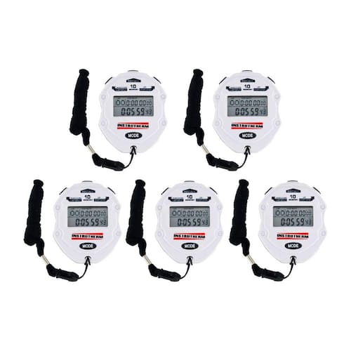 KIT 5 CRONÔMETRO DIGITAL COM 99 LAP E SPLIT, 10 MEMÓRIAS, RELÓGIO, CALENDÁRIO, ALARME, TEMPORIZADOR, CONTADOR MANUAL PROGRESSIVO E REGRESSIVO MODELO CD-3000 DESCRIÇÃO: Cronômetro digital modelo CD-3000 possui display duplo de 6 dígitos, pesando 24,5g realiza contagem manual progressiva e regressiva, relógio com calendário, alarme programável, contagens para 99 LAPS e 99 SPLIT com resolução de 1/100, temporizador com alarme e memória para armazenar 10 contagens. DESTAQUES: Display com 6 dígitos de cristal líquido, resolução de 1/100, contagem manual progressiva e regressiva, alarme, calendário, relógio, memória para 10 contagens. APLICAÇÕES: O cronômetro digital CD-3000 é utilizado para medir pequenos intervalos de tempo, geralmente até centésimos de segundos, amplamente utilizado na industria, laboratório, cozinha, práticas esportívas e etc. ESPECIFICAÇÕES TÉCNICAS: Display de cristal líquido com 6 dígitos Relógio eletrônico Escala do cronômetro: “23H59´59” Resolução 1/100 seg < 30 minutos Botão seletor de funções Cronômetro Alarme Ajuste data/Hora LAP Memória para 99 LAPS SPLIT Seleção de formato 12/24 Temperatura de Operação: 0 a 50°C Umidade de Operação: 30 a 80 % UR Alimentação: Bateria 1.5 v Peso: 24,5 g Dimensões(C x L x A): 78x65x18mm ACESSÓRIOS FORNECIDOS: 5 - Cronômetro digital CD-3000 5 - Bateria 1.5 v Manual de instruções