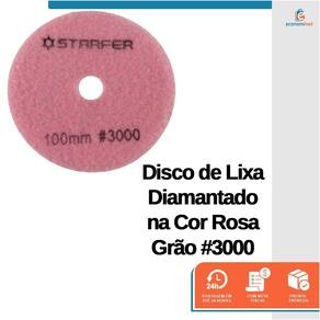 Disco de lixa diamantado para polimento, abrasivo em resina branca, com pluma na parte traseira. Indicado para lixar e polir mármore e porcelanato.Para uso em disco de borracha 100mm - StarferEspecificações técnicas:Diâmetro do disco: 100mm.Diâmetro do furo: 16mm.Rotação máxima: 4800rpm.Uso: Furadeira e Esmerilhadeira.Quantidade: 5 unidades.Grão: Cor rosa #3000.Fixa Fácil: SimRef.: 4003969Marca: Starfer