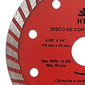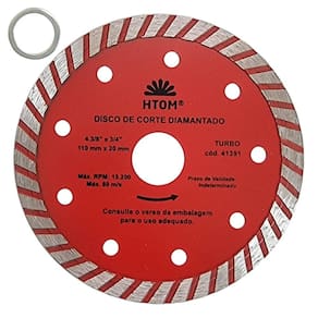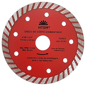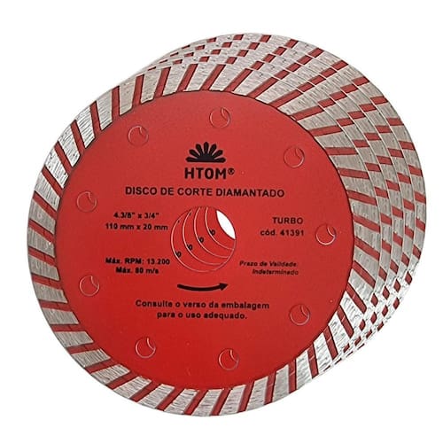 Kit com 5 Discos de Corte Diamantado Turbo 110mm x 20mm Profissional HTOM Disco de Corte Diamantado Turbo 110mm indicado para corte com Serra Mármore Makita . Corte a seco ou úmido em concreto baixo mármore, basalto, MPA, alvenaria, tijolo, granito, telha, ardósia e cerâmica. - Marca: HTOM - Referência: HTOM-41391-5X - Kit exclusivo com 5 discos turno para serra mármore - Diâmetro: 110 mm - Furo: 20mm - Acompanha anel para 16mm - Altura da borda de corte: 2.2mm - Largura da borda de corte: 8.5mm - Espessura: 1.8mm - Rotação máxima: 13.200 rpm - Combina cortes rápidos e acabamento - Corte a seco ou úmido refrigerado - Indicador para corte sem água em Concreto baixo MPA, alvenaria, tijolo, telha, ardósia e cerâmica - Indicado para corte com água em concreto alto MPA, mármore e granito. - Use sempre EPI - Peso: 95 gramas - : 90 dias Marca: Não Informado Ean: 7796717982892