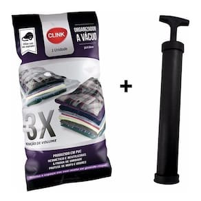 Kit 5 Embalagens a Vácuo, 3x Mais Espaço no Seu Guarda Roupa e Mala Com Bomba De SucçãoQuantidade: 5 unidades Tamanho: 70 x 110cm Utiliza com seu aspirador de pó ou com a Bomba de sucção que acompanha esse kit. Produzido em pvc Hermético e reutilizável À prova de umidade Protege de mofo e odores Otimiza o espaço em sua mala ou guarda-roupas em até 3 x mais Modo de usar: 1 Insira na embalagem edredons, travesseiros, cobertores, casacos ou qualquer item que você desejar guardar e proteger. As peças devem ser totalmente secas, limpas e ocupar o espaço da embalagem até a linha pontilhada do zíper de fechamento. 2 Use um pano úmido para limpar o zíper de fechamento e coloque o feixe de plástico para instalá-lo. 3 Abra a válvula e encaixe seu aspirador de pó ou a bomba de sucção que acompanha nesse kitVantagens do produto- Proteger seu casaco, cobertor, roupas, edredons e etc de mofo, poeira e umidade. - Reduz em até 3 vezes o espaço da sua mala e guarda-roupa - Você pode reutilizar várias vezes - Protege suas roupas de odores fortes - Evitar que as roupas se danifiquem ao passar do tempo