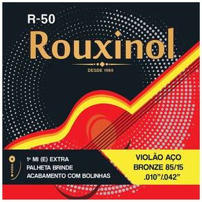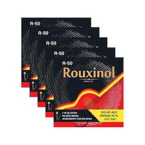 Kit 5 Encordoamento Violão Aço R50 Rouxinol .010” + BrindeArames hexagonais (sextavados) importados dos EUA e produzidos em máquinas modernas, automáticas/computadorizadas, agregando ainda mais qualidade. R-50 conta com a leveza no toque, bem como a clareza de timbre e brilho.Características:Marca: RouxinolMateriais: AçoTensão: MédiaBordões: Alma de aço carbono estanhado, encapada com metal prateadoPrimas: Aço inoxidável (não enferrujam).Bordões: Alma de aço hexagonal, encapada com Bronze 85/15. Itens Inclusos:5 Encordoamento Violão Aço R50 Rouxinol .010” + Brinde5 1ª Corda Mi(E) Extra5 Palhetas