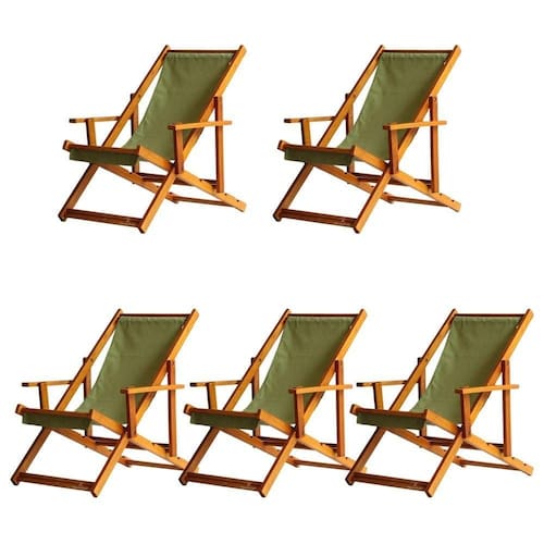 Kit 5 Espreguiçadeira Preguiçosa Dobrável Mel Cb-verde 5 ESPREGUIÇADEIRAS ENVERNIZADA MEL C/BSabe aquele final de tarde que você tanto espera para tirar um descanso merecido? Ou aquela viagem para a praia programada a meses com a família? Pois é, nossas cadeiras espreguiçadeira serve exatamente para esses momentos, com várias opções de cores, os tecidos além de charmosos são hidro-repelentes e se adequam a qualquer ambiente, facilmente removíveis para higienização.Estrutura 100% de madeira maciça de ótima qualidade, a espreguiçadeira é totalmente dobrável e reclinável (4 posições de ângulo), com descanso para braço, sendo possível montar invertida sem o encosto de braço, perfeita para seu lazer em todos os ambientes, esse é o item que definitivamente não pode faltar na vida de quem de fato, quer aproveitar bons momentos! FICHA TÉCNICA DO PRODUTO:04 Níveis de Regulagem de Altura;Tecido Reforçado;Fabricada em Madeira Maciça Pinus;Peso aproximado: 7,5 Kg;Suporta aproximadamente 120 kg;Cor da Madeira: Mel Dimensões aproximadas do Produto:Altura 1: 69 cm;Altura 2: 82 cm;Altura 3: 91 cm;Altura 4: 100 cm;Profundidade: 105 cm. Dimensão aproximada total:Comprimento: 135 cm;Largura: 66 cm; Informações Adicionais:Garantia: 90 dias contra defeitos de fabricação.Acompanha 5 cadeiras Obs. A cor pode variar da foto conforme a tonalidade da madeira e iluminação.. !! Marca: Brasil Móveis