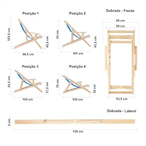 Espreguiçadeira reclinável com 4 posições, fabricada em madeira maciça eucalipto com acabamento envernizado. Dobrável, resistente (suporta até 100kg) e com tecido hidro-repelente removível para fácil limpeza. Ideal para praia, piscina ou varanda.
