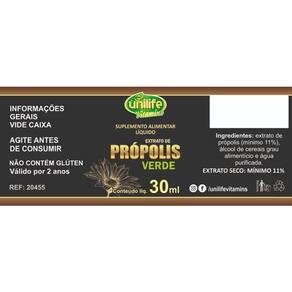 Kit 5 Extrato de Própolis Verde Unilife 30ml Sobre o produto EXTRATO PRÓPOLIS VERDE Unilife Vitamins Desenvolvido a partir de extrato de própolis verde em pó, o produto é livre de glúten Modo de usar 1 gota ao dia. Ingredientes Extrato de própolis 20%, ácido ascórbico, bisglicinato de zinco, selenometionina, antiumectantes: silicato de magnésio, estearato de magnésio e dióxido de silício. Marca: Não Informado