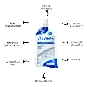 GEL CLINICO CONDUTOR - KIT COM 5 UNIDADES DE 100 MLO Gel Clínico RMC é inodoro e hipoalergênico. Sua composição é livre de álcool e sais, não provocando o ressecamento do cabeçote dos aparelhos e aumentando assim a vida útil dos mesmos, indicado pelos maiores fabricantes de equipamentos médicos e estéticos. Sua consistência é firme e de fácil remoção, não escorre e não gruda. Possui teste de análise dermatológica aprovado pelo Instituto de Pesquisa Adolfo Lutz, um dos mais renomados institutos de pesquisas do Brasil.