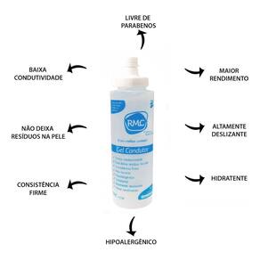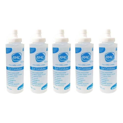 KIt 5- Gel Incolor De 300 ML Hipoalergênico Certificado Pela AnvisaO Gel Condutor Incolor é utilizado em diversos exames de eletrocardiograma para que possa conduzir impulsos elétricos de aparelhos tais como ultrassom de imagem e estética (alta e baixa potência), ecógrafos, dopplers, desfibriladores, TENS e FES, bisturis elétricos e qualquer aparelho de eletroterapia que utilize gel para meio de contato.Propriedades:Tem uma ótima condutividade, altamente deslizante, hipoalergênico, hidratante e não irrita a pele. Obtendo uma viscosidade ideal, pois não escorre, e proporciona um maior rendimento. É atóxico, inodoro, com PH neutro, hidrossolúvel e facilmente removível. Não mancha a roupa, não deixa resíduo na pele e não é gorduroso. Por ser isento de sal e álcool, não danifica o transdutor e não provoca o ressecamento do cabeçote do aparelho, aumentando assim a sua vida útil. Indicado pelos maiores fabricantes de equipamentos médicos e estéticos. Possui teste de análise dermatológica aprovado pelo Instituto de Pesquisa Adolfo Lutz, um dos mais renomados institutos de pesquisas do Brasil.Informações:Ideal:eletrocardiogramaultrassomEcógrafosDopplersDesfibriladoresBisturis elétricosTENS / FESPH NeutroGramas: 300gMarca: RMC