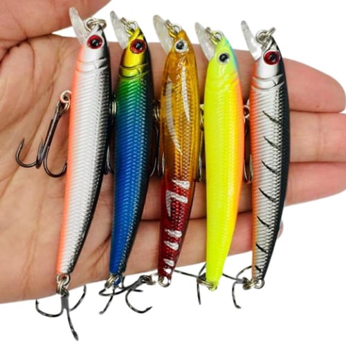 O kit é composto de iscas 5 iscas para pesca em rio, lago, represas, mar e pesqueiros, suas cores holográficas e olhos 3d são determinantes para uma boa pescaria. Oferecem grande resultado na pesca de tucunarés , traíras, tabaranas , piranhas, robalos entre outros predadores.