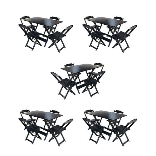 Kit 5 Jogos De Mesa Dobravel Com 4 Cadeiras De Madeira 120x70 Para Restaurante E Bar - Preto O produto é ideal para bares, restaurantes, estabelecimentos, áreas de lazer e também para sua casa. Feito em madeira maciça, tornando resistentes e duráveis. Seu design permite que seja encaixado em qualquer ambiente, trazendo um toque a mais para seu estabelecimento. Além de sua durabilidade, o que lhe trará conforto para servir seus clientes. Por ser dobrável torna-se mais fácil guardar, manusear e limpar o produto.