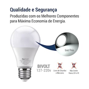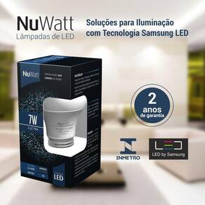 A NuWatt inova ao trazer ao mercado brasileiro a melhor tecnologia em lâmpadas de LED. As lâmpadas NuWatt proporcionam a você inúmeras vantagens, que vão desde a sua durabilidade de 25.000 horas, economia de energia e excelência na qualidade, garantida pela tecnologia Samsung LED. Além disso, as lâmpadas não emitem raios U.V e I.R. e contam com toda a segurança da certificação pelo INMETRO. De fácil instalação e sem manutenção, agora você pode contar com a melhor solução em iluminação com tecnologia Samsung aí na sua casa!_x005F_x000D__x005F_x000D_ _x005F_x000D__x005F_x000D_A NuWatt Tem:_x005F_x000D__x005F_x000D_ _x005F_x000D__x005F_x000D_• 2 ANOS DE GARANTIA (uma das maiores garantias do mercado)_x005F_x000D_• DURABILIDADE DE 25.000 HORAS_x005F_x000D_• TECNOLOGIA SAMSUNG LED INSIDE_x005F_x000D_• CERTIFICADO INMETRO_x005F_x000D__x005F_x000D_ _x005F_x000D__x005F_x000D_Informações técnicas:_x005F_x000D__x005F_x000D_ _x005F_x000D__x005F_x000D_Tensão da rede: 127-220 V_x005F_x000D_Potência: 7 W_x005F_x000D_Fluxo Luminoso: 630 lm_x005F_x000D_Eficiência Energética: 90 lm/W_x005F_x000D_Temperatura da Cor: 6.500 K_x005F_x000D_Índice de Reprodução de Cor: 80 Ra_x005F_x000D_Vida Média: 25.000 h_x005F_x000D_Frequência: 60 Hz_x005F_x000D_Corrente: 60 mA [127 V] | 36 mA [220 V]_x005F_x000D_Fator de Potência: >0,70_x005F_x000D_Base: E27_x005F_x000D_Potência Equivalente Incandescente: 40 W_x005F_x000D_Potência Equivalente Fluorescente: 13 W_x005F_x000D_Dimensões: 60 mm [D] x 110 mm [C]_x005F_x000D_Peso: 43 g Marca: NUWATT