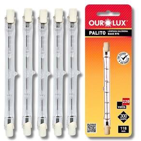 Kit 5 lâmpadas halógena palito 300w 220v j118 ourolux A lâmpada halógena palito 300w 220v j118 ourolux oferece alta luminosidade e excelente desempenho para refletores, luminárias e sistemas de iluminação externa ou interna. Ideal para ambientes que exigem luz intensa e foco, proporciona acendimento instantâneo e maior vida útil se comparada às lâmpadas incandescentes comuns. Compatível com soquete r7s.