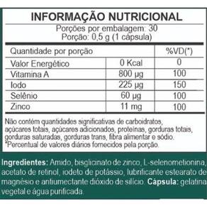 Amido, bisglicinato de Zinco, L-selenometionina, acetato de retinol, iodeto de potássio, lubrificante estearato de magnésio e antiumectante dióxido de silício. Cápsula: gelatina vegetal e água purificada.