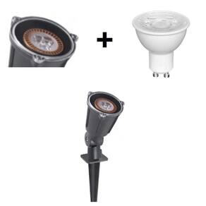 Luminária Espeto para Jardim para lâmpada LED GU-10, corpo em nylon plástico de engenharia na cor verde. Resistente as intempéries do tempo. Tampa/lente transparente de policarbonato, fixada com parafusos bicromatizados. Soquete GU-10. Regulagens nas articulações, permitindo ajuste do foco de luz para qualquer direção.