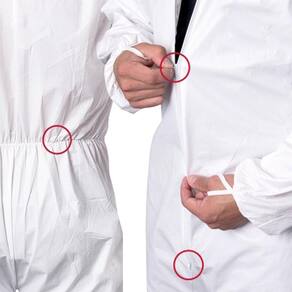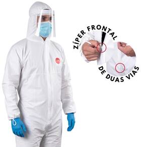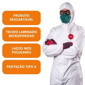Macacão de segurança confeccionado em tecido laminado microporoso, capuz, fecho frontal em zíper de duas vias, laços nos polegares, elástico na metade da cintura, pulsos e tornozelos, emendas costuradas, tecido com tratamento antiestático.