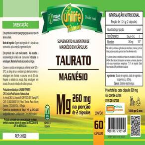 Kit 5 Suplemento Alimentar em Cápsula de Taurato de Magnésio Unilife 60 cápsulas 100% da Ingestão Diária Recomendada de Magnésio O Magnésio é um mineral que desempenha muitas funções biológicas em nosso organismo, está envolvido em vários sistemas enzimáticos e na contração muscular. Este mineral também interfere no humor, quando os níveis estão baixos a liberação de adrenalina é estimulada, o que deixa a pessoa mais agitada, aumentando a secreção de cortisol que é conhecido como o hormônio do , quando o magnésio está equilibrado incentiva a produção de serotonina que é responsável pela sensação de bem-estar. Junto do fósforo e cálcio, está presente nos ossos, embora em menores quantidades, porém a falta deste nutriente pode levar à fragilidade dos ossos. O taurato de Magnésio é um suplemento resultado da complexação do magnésio à taurina. A Taurina é um aminoácido produzido pelo nosso fígado, importante para o desenvolvimento do sistema nervoso e para a saúde dos olhos. Benefícios do uso de Taurato de Magnésio em cápsulas: Tem relação com os hormônios do bem estar; Essencial para o bom funcionamento do organismo; Está presente nos ossos esqueleto e dentes, promovendo a absorção do cálcio; Tem relação com a contração e o relaxamento muscular. Como usar o Taurato de Magnésio em cápsulas Sugere-se a ingestão de 1 cápsula, duas vezes ao dia, após a refeição. Ingerir com líquido. Ingredientes do Taurato de Magnésio em cápsulas Taurato de magnésio, óxido de magnésio e excipiente .S.P 620mg. Cápsula: gelatina vegetal e água Marca: Não Informado