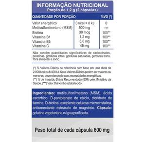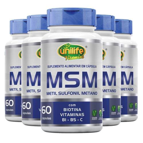 Kit 5 Msm Metil Sufonil Metano + Biotina E Vitamina Unilife 60 Cápsulas MSM Metil Sufonil Metano + Biotina e Vitamina Unilife 60 cápsulas Modo de ingestão: sugere-se a ingestão de 1 cápsula 2 vezes ao dia. Ingerir com líquido. MSM é uma forma natural de enxofre orgânico encontrada em todos os organismos vivos. Metade do enxofre presente no corpo se localiza nos músculos e o restante no cérebro, cabelos, unhas, epiderme e ossos. O enxofre é fundamental para a fabricação de colágeno e construção de metionina e cisteína (aminoácidos). Junto com as vitaminas B1, B5, B7 e C, a ação do MSM é potencializada. Este produto é recomendado para um grupo populacional com 19 anos ou mais. Ean: 7908609503980