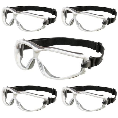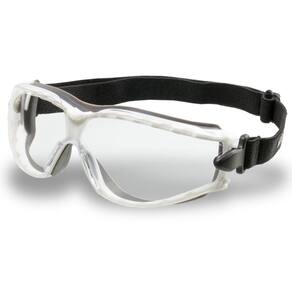 Óculos de proteção, modelo ampla-visão, constituído de armação confeccionada em uma única peça de plástico rígido na cor branca recoberta internamente com borracha, termoplástica macia cinza, sistema de ventilação indireta composto de dezoito fendas, sendo dez na parte superior e oito na parte inferior da armação, ajuste através de tirante elástico preto.