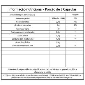 Ingredientes: Óleo de semente de uva. Cápsula: gelatina bovina, umectante glicerina e água.