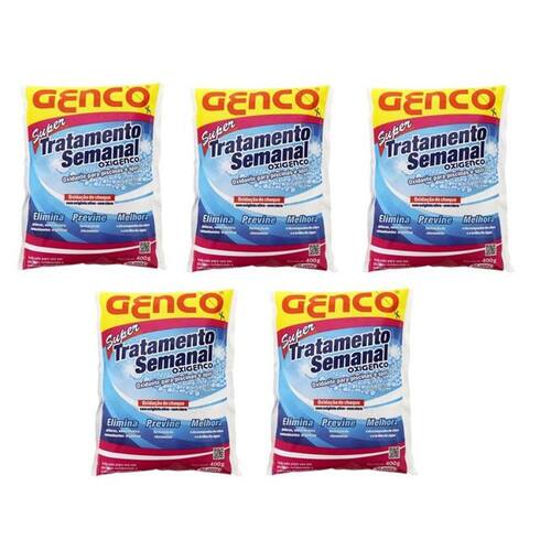 Oxigenco GencoSuper tratamento semanal oxigenco é um agente oxidante para águas de piscinas e spas que utilizam cloro e que necessitam de oxidação frequente para destruir os poluentes que consomem o residual de cloro livre, causam turbidez na água, odores desagradáveis e irritação da pele e dos olhos. Vantagens:- Oxidação de choque: destrói contaminantes orgânicos.- Elimina a oleosidades da água, destrói contaminantes orgânicos e restaura o brilho da água de piscinas e spas.- Melhora a eficiência do cloro.- Restaura o brilho e diminuí a formação de espumas da água em spas.- Trata 40.000 Litros. - Oxigênio ativo.- Previne a formação de cloraminas.- Tratamento semanal- Indicado para todos os tipos de piscinas fibra, vinil ou alvenaria .Instruções de uso:1 Com a filtração ligada adicionar, diretamente sobre a superfície da água, 400 g / 40 m 400 gramas por 40 mil litros de água de oxigenco. Em seguida adicionar 1,5 mL / m 1,5 mililitros por 1000 litros de água de clarificante Genfloc.2 Em piscinas muito utilizadas coletivas poderão necessitar de dosagens maiores, 1.000 g / 40 m 1.000 gramas por 40 mil litros de água .Manter a filtração ligada pelo tempo necessário para que toda água da piscina passe pelo filtro. Esse tratamento pode ser feito semanalmente. Item incluso:5 Oxigenco Tratamento Semanal 1kg cada.