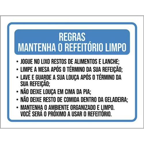Kit 5 Placa Regras Mantenha Refeitório Limpo Lixo Limpe36x46 Placas de sinalizaço fabricadas com poliestireno de alto impacto PSAI de 2mm e impressão ultravioleta.