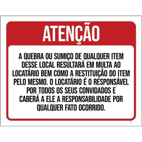 Kit 5 Placas Atenção Quebra Sumiço Multa Locatário 36x46 Placas de sinalizaço fabricadas com poliestireno de alto impacto PSAI de 2mm e impressão ultravioleta.