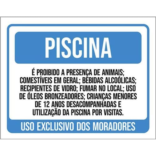 Kit 5 Placas Piscina Exclusivo Moradores 36x46 Placas de sinalizaço fabricadas com poliestireno de alto impacto PSAI de 2mm e impressão ultravioleta.