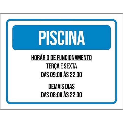 Kit 5 Placas Piscina Horários Funcionamento 36x46 Placas de sinalizaço fabricadas com poliestireno de alto impacto PSAI de 2mm e impressão ultravioleta.
