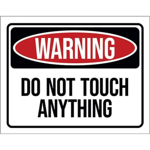 Kit 5 Placas Warning Do Not Touch Anything 36x46 Placas de sinalizaço fabricadas com poliestireno de alto impacto PSAI de 2mm e impressão ultravioleta.