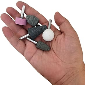 Kit 5 Ponta Montada Rebolo Abrasivo Haste 6mm Multiuso Bravo Tools - Marca: Bravo Tools - Referência: BV1006 - Indicada para limpezas e acabamentos em superfícies - Diâmetro da haste: 6mm - 1 Ponta Cilíndrica Branca 22 x 22mm Grão Fino - 1 Ponta Tipo Roda Rosa 24 x 12,5mm Grão Médio - 1 Ponta Tipo Bala Cinza 16 x 26mm Grão Grosso - 1 Ponta Tipo Árvore Cinza 24 x 35mm Grão Grosso - 1 Ponta Tipo Cônica Cinza 19 x 27mm Grão Grosso - Material da ponta: Óxido de alumínio Corundum - As pontas montadas são indicadas para uso geral - Uso em retificadeiras e furadeiras de qualquer marca com mandril de 6mm - Indicada para afiação, esmerilhamento e desbaste em metais, joias, pedras preciosas, vidro, entre outros materiais - Ideal para trabalhos detalhados em uma variedade de superfícies, oferecendo remoção de material suave e precisa - Seu formato facilita o trabalho em locais de difícil acesso - Velocidade máxima: 25.000rpm - Peso bruto: 90 gramas - : 90 dias contra defeitos de fabricação Marca: Não Informado Ean: 7734625974851
