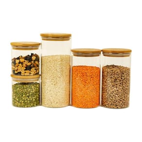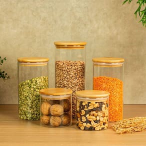 Este é o KIT 5 POTES DE VIDRO COM TAMPA BAMBU 1650, 1100 e 500ML.
