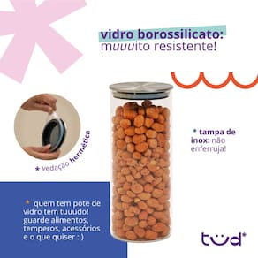 Os potes são práticos, seguros e decorativos. São bons demais para armazenar alimentos, temperos, algodão, itens de escritório e o que precisar! São de vidro borossilicato, material que não retém gosto e nem cheiro após a limpeza. Além disso, o anel de silicone na tampa garante a vedação, conservando o conteúdo por muuuito mais tempo :)