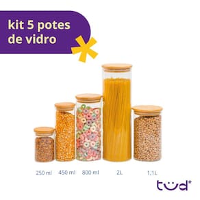 "Oii! Tüd bem? Vem saber mais sobre o kit de 5 potes de vidro com tampa de bambu herméticos de 250ml, 450ml, 800ml, 1,1L e 2L da Tüd!