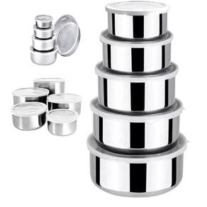 KIT 5 POTES TIGELAS INOX COM TAMPA HERMÉTICA - JOGO DE VASILHAS PARA ARMAZENAMENTOEste Kit com 5 Potes Tigelas de Aço Inox combina elegância, praticidade e durabilidade em um só produto. Ideal para armazenar, misturar ou servir alimentos, o conjunto traz um design moderno e é fácil de limpar, sendo perfeito para quem busca versatilidade na cozinha.Material Resistente: Feito de aço inoxidável de alta qualidade, é seguro para o contato com alimentos, além de ser resistente a impactos e corrosão.Tampas Herméticas: Cada pote vem com tampa hermética, garantindo o armazenamento seguro e preservando a qualidade dos alimentos por mais tempo.Multifuncional: Pode ser utilizado para misturar, servir ou armazenar alimentos, como saladas, molhos, condimentos, entre outros.Especificações:Não pode ser levado ao fogo ou micro-ondas.Tamanhos disponíveis no kit: 10 cm, 12 cm, 14 cm, 16 cm e 18 cm.Dimensões (do menor para o maior):4,5 cm x 10 cm - 250 ml5 cm x 12 cm - 430 ml6 cm x 14 cm - 690 ml6,5 cm x 16 cm - 1000 ml7 cm x 18 cm - 1500 mlDicas de Uso:Utilize esponja macia para não riscar ou danificar o brilho do inox.Enxague bem as peças e, sempre que possível, utilize água quente para renovar o brilho e garantir uma limpeza eficiente.Com este Jogo de Potes Inox, sua cozinha fica mais organizada e sofisticada, proporcionando praticidade no dia a dia e mantendo seus alimentos frescos por mais tempo! Marca: Não Informado