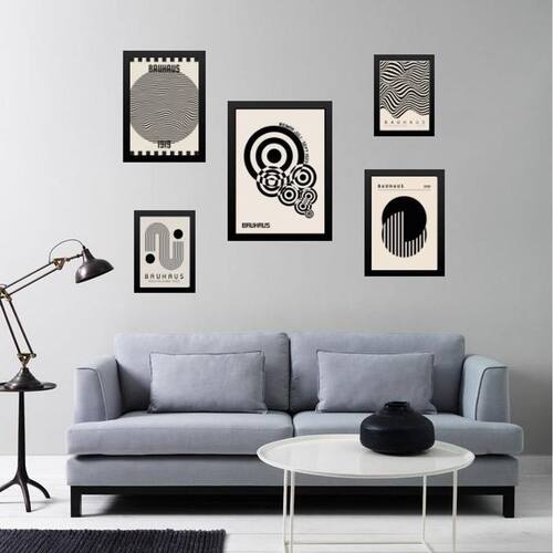 Kit 5 quadros bauhaus preto e branco Moldura: madeira preta Informações do produto tire todas as suas dúvidas no descritivo abaixo: decoração para quarto, sala, cozinha, escritório, área gourmet e muito mais. Chega de paredes vazias medidas - kit composto por 5 quadros, sendo 2 quadros com medida 18x24cm, 2 quadros com 24x33cm e 1 quadro com medida 33x45cm. Material do papel - papel fotográfico brilhante de altíssima resolução acabamento - todos os quadros são acompanhados de uma película de acetato para proteção da imagem. - os quadros são embalados de forma segura com plástico bolha com camada dupla de acordo com o tamanho dos quadros. Garantia - garantia de 3 meses. Meu quadro chegou. Como posso fixá-lo Você precisa apenas de um martelo e um prego, pois os quadros já vão acompanhados de penduradores. Esta é a forma mais indicada. Caso prefira, você pode utilizar uma fita dupla face neste caso, sugerimos de alta qualidade para evitar que descole e seu quadro caia . Como posso limpar meu quadro A limpeza é feita como um móvel comum da sua casa. Apenas um pano seco ou espanador são suficientes para tal