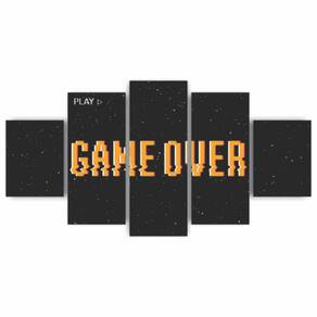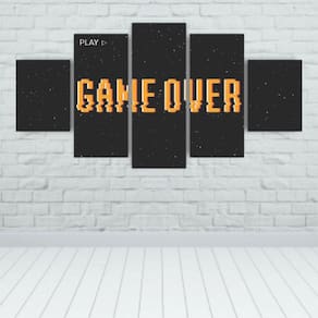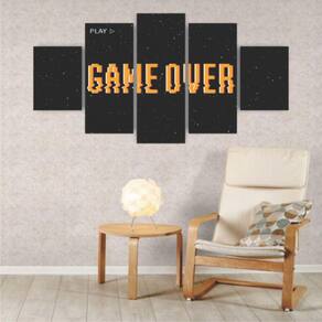 Kit 5 Quadros Decorativos Mdf Game Over Jogos Gamer Material: Quadros produzido em mdf - dimensões: Tamanho total do quadro montado na parede: 115cm x 60cm - 1 peça central com 60x22cm - 2 peças intermediárias: 22x50cm - 2 peças laterais: 22x30cm. - deixar espaçamento entre as peças na hora da instalação = 1 cm -informações técnicas: O quadro não precisa de moldura, estão pronto para pendurar na parede. São feitos em adesivos fosco e impressos em alta qualidade. Aplicado em mdf com espessura de 3mm. - instalação: Não é necessário furar a parede para instalação, pois, enviamos fitas 3m com grande poder adesivo para facilitar a instalação. É necessário na hora da instalação posicionar o quadro em 1cm de largura entre eles para melhor qualidade de visualização. Limpe o local que vai ser instalado o quadro com um pano úmido, após secar o local, visualize como Vai ser o alinhamento, e retire a proteção da fita dupla face parte verde da fita e pressione No lugar desejado para a fixação. - limpeza após instalação: A limpeza pode ser realizada apenas com um pano seco macio, se desejar pode ser úmido porém sem conter álcool ou produtos químicos.