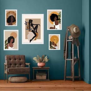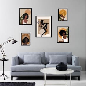 Kit 5 quadros mulheres negras boho - com vidro Moldura: madeira branca Informações do produto tire todas as suas dúvidas no descritivo abaixo: decoração para quarto, sala, cozinha, escritório, área gourmet e muito mais. Chega de paredes vazias medidas - kit composto por 5 quadros, sendo 2 quadros com medida 18x24cm, 2 quadros com 24x33cm e 1 quadro com medida 33x45cm. Material do papel - papel fotográfico brilhante de altíssima resolução acabamento - todos os quadros são acompanhados de vidro para proteção da imagem. - moldura em madeira maciça na cor preta ou branca conforme produto escolhido e pendurador . - os quadros são embalados de forma segura com plástico bolha com camada dupla de acordo com o tamanho dos quadros. Garantia - garantia de 3 meses. Meu quadro chegou. Como posso fixá-lo Você precisa apenas de um martelo e um prego, pois os quadros já vão acompanhados de penduradores. Esta é a forma mais indicada. Como posso limpar meu quadro A limpeza é feita como um móvel comum da sua casa. Apenas um pano seco ou espanador são suficientes para tal