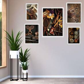 Kit 5 quadros tênis vintage - raquetes - com vidro Moldura: madeira preta Informações do produto tire todas as suas dúvidas no descritivo abaixo: decoração para quarto, sala, cozinha, escritório, área gourmet e muito mais. Chega de paredes vazias medidas - kit composto por 5 quadros, sendo 2 quadros com medida 18x24cm, 2 quadros com 24x33cm e 1 quadro com medida 33x45cm. Material do papel - papel fotográfico brilhante de altíssima resolução acabamento - todos os quadros são acompanhados de vidro para proteção da imagem. - moldura em madeira maciça na cor preta ou branca conforme produto escolhido e pendurador . - os quadros são embalados de forma segura com plástico bolha com camada dupla de acordo com o tamanho dos quadros. Garantia - garantia de 3 meses. Meu quadro chegou. Como posso fixá-lo Você precisa apenas de um martelo e um prego, pois os quadros já vão acompanhados de penduradores. Esta é a forma mais indicada. Como posso limpar meu quadro A limpeza é feita como um móvel comum da sua casa. Apenas um pano seco ou espanador são suficientes para tal