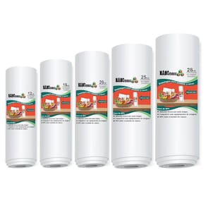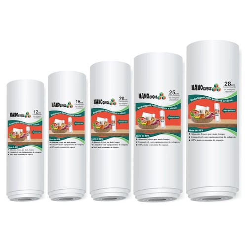 Kit 5 Rolos 12/15/20/25/28x500 Sacos Ranhura Seladoras Vácuo Embalagens 5 rolos: 12/ 15/ 20/ 25/ 28 cm x 500 cm NANOCUBOS para seladoras a vácuo. Embalar produtos a vácuo é a melhor forma de mantê-los sempre protegidos por muito mais tempo. Ao embalar alimentos, a validade deles é completamente estendida, pois eles não terão nenhum contato com o ar e serão pouco afetados pela ação do tempo. Você pode embalar tanto alimentos crus como alimentos já preparados para serem consumidos em outro momento. Você economiza muito dinheiro e evita o desperdício Os sacos para vácuo Nanocubos são produzidos com alta tecnologia em Nylon Poli seguindo padrões de qualidade internacional. Possuem 12 micras, 3 barreiras de proteção, sem presença de BPA Não tóxicos e funcionam com equipamentos de embalagens a vácuo. Além de alimentos, é possível utilizá-lo com objetos pessoais, documentos ou utensílios, conservando-os como novos por muito tempo e aumentando sua vida útil.