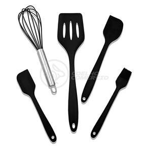 Dê um toque de modernidade e eficiência à sua cozinha com o nosso Kit de Utensílios de Cozinha em Silicone. Cada conjunto contém 5 utensílios essenciais, projetados para simplificar todas as suas tarefas culinárias. Vantagens: Saúde Ambiental: Fabricados com material silicone de alta qualidade, esses utensílios são uma escolha sustentável para a sua cozinha, ajudando a reduzir o desperdício. Saúde e Segurança: Livres de BPA e outros produtos químicos nocivos, esses utensílios garantem que você cozinhe com total segurança, protegendo a saúde da sua família. Fácil de Limpar: Graças à sua superfície lisa e antiaderente, esses utensílios são incrivelmente fáceis de limpar, poupando tempo e esforço na sua rotina diária. Fácil de Usar: Com design ergonômico e leve, esses utensílios são confortáveis de segurar e manusear, tornando suas atividades na cozinha mais simples e agradáveis. Características: Cor: Preto; Materiais: Silicone e Metal (Batedor Manual). Tamanho da Embalagem (Aprox.): Altura: 8,5 cm; Largura: 29,5 cm; Profundidade: 7 cm. Itens Inclusos: - 1x Pincel; - 1x Batedor de Ovos; - 1x Espátula; - 1x Espátula Grande; - 1x Espátula Pequena. Marca: Aquilae