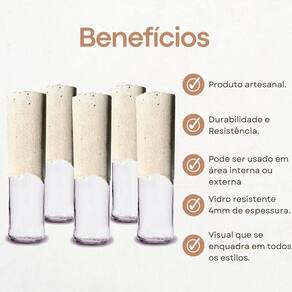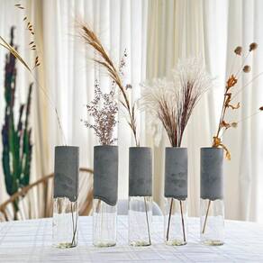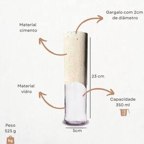 Especificações: Altura: 23 cm Largura: 5 cm Diâmetro: 5 cm Peso: 525 g Itens inclusos: 5 - Vaso decorativo de cimento e vidro Qualquer duvida estamos a disposição!