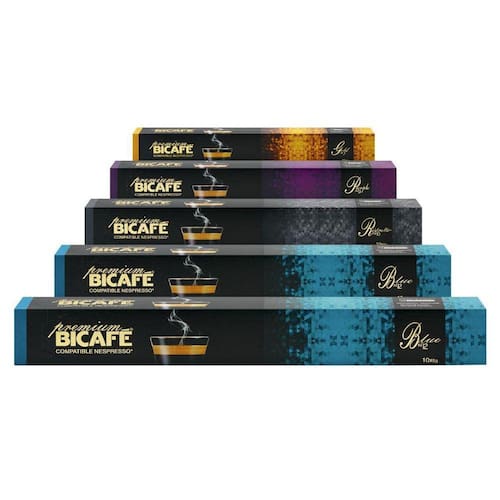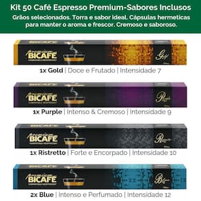 Kit 50 Cápsulas Compatíveis Nespresso Café Premium BicaféPor que a cápsula da Bicafé- 100 % compatível com Nespresso®- Mais cremoso e intenso: 20% mais de café por cápsula- Qualidade e frescura do café recém moído: cápsulas hermeticamente fechadas- Produto importado da Europa, vendido no mundo todo: USA, França, Inglaterra, Bélgica, Espanha, Suíça, etc.- Produzido com energia limpa, proveniente de energia solar.Conteúdo do Kit- 5 Caixas de 10 cápsulas para Nespresso. Totalizando 50 cápsulas para Nespresso. Sabores e quantidades do Kit- 2 Caixas de Blue - 1 Caixas de Ristretto- 1 Caixa de Purple- 1 Caixa de GoldCompatível com Nespresso e Oster- Nossas cápsulas funcionam perfeitamente em todos os modelos de máquinas da Nespresso. 100% compatível. Sua máquina estará em perfeito estado sempre. - São compatíveis com os seguintes modelos: Inissia, Pixie, U, Essenza DeLonghi, Essenza Mini, Prodigio, Citz, Oster Primalatte, Lattisima One, Lattisima Touch, Maestria, Concept e Expert. Escolha de Sabores- Infelizmente não é possível a escolha de sabores. São kits fechados, prontos para envio. Você encontra a relação de sabores inclusos no kit, nas imagens e na descrição escrita do anúncio.Envio do pedido- Assim que o pagamento for confirmado, seu pedido será postado no prazo máximo de 24 horas úteis.Sabores dos Cafés inclusos no Kit- Gold (Intensidade 7)Cafés Arábica de qualidade superior originários da América do Sul, suavemente torrados para harmonizar as notas doces e frutadas e um toque de acidez. Sem açúcar. Dose: 40ml.- Purple (Intensidade 9)Uma seleção de cafés da América do Sul e Central, com uma torra especialmente desenvolvida para reforçar o caráter de cada origem. Purple possui um perfil frutado e uma nota final a cacau. Sem açúcar. Dose: 40ml.- Ristretto (Intensidade 10)Aos melhores cafés Arábica Africanos e da América do Sul, juntamos um toque de robusta para criar o derradeiro típico café português: forte e encorpado. Sem açúcar. Dose: 40ml.- Blue (Intensidade 12)Um ristretto audacioso, composto por cafés Robusta e Arábica da América do Sul, torrados para que apresentem uma forte intensidade equilibrada por um corpo rico e um creme abundante. Sem açúcar. Dose: 40ml.Detalhes do Produto- Marca: Bicafé- Validade: 1 ano- Condições de armazenamento: Conservar em local fresco e seco- Fabricado em PortugalMarca de um terceiro não relacionado à Bicafé.