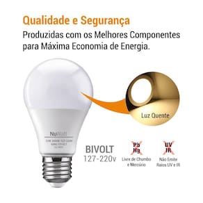 A NuWatt inova ao trazer ao mercado brasileiro a melhor tecnologia em lâmpadas Samsung de LED. As lâmpadas NuWatt proporcionam a você inúmeras vantagens, que vão desde a sua durabilidade de 25.000 horas, economia de energia e excelência na qualidade, garantida pela tecnologia Samsung LED. Além disso, as lâmpadas não emitem raios U.V e I.R. e contam com toda a segurança da certificação pelo INMETRO. De fácil instalação e sem manutenção, agora você pode contar com a melhor solução em iluminação com tecnologia Samsung aí na sua casa!_x005F_x000D__x005F_x000D_ _x005F_x000D__x005F_x000D_A NuWatt Tem:_x005F_x000D__x005F_x000D_ _x005F_x000D__x005F_x000D_• 2 ANOS DE GARANTIA (uma das maiores garantias do mercado)_x005F_x000D_• DURABILIDADE DE 25.000 HORAS_x005F_x000D_• TECNOLOGIA SAMSUNG LED INSIDE_x005F_x000D_• CERTIFICADO INMETRO_x005F_x000D__x005F_x000D_ _x005F_x000D__x005F_x000D_Informações técnicas:_x005F_x000D__x005F_x000D_ _x005F_x000D__x005F_x000D_Tensão da rede: 127-220 V_x005F_x000D_Potência: 12 W_x005F_x000D_Fluxo Luminoso: 1050 lm_x005F_x000D_Eficiência Energética: 87,5 lm/W_x005F_x000D_Temperatura da Cor: 3.000 K_x005F_x000D_Índice de Reprodução de Cor: 80 Ra_x005F_x000D_Vida Média: 25.000 h_x005F_x000D_Frequência: 60 Hz_x005F_x000D_Corrente: 98 mA [127 V] | 61 mA [220 V]_x005F_x000D_Fator de Potência: >0,70_x005F_x000D_Base: E27_x005F_x000D_Potência Equivalente Incandescente: 75 W_x005F_x000D_Potência Equivalente Fluorescente: 20 W_x005F_x000D_Dimensões: 65 mm [D] x 128 mm [C]_x005F_x000D_Peso: 55 g Marca: NUWATT