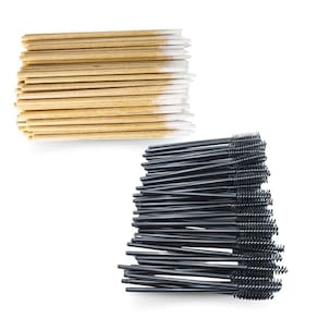 Contém: 01 - pacote com 50 pincéis descartáveis para sobrancelhas e cílios. 01 - pacote com 100 mini palitos de madeira com algodão na ponta