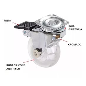 ESPECIFICAÇÕES TÉCNICAS: Material da Base: Aço. Material da Roda: Silicone Gel Anti-risco. Altura total do Rodízio: 52mm ou 5,2cm. Diâmetro da Rodinha: 35mm ou 3,5cm. Espessura chapa 1,5mm. Tamanho da Chapa: 42mm 4,2cm x 32mm 3,2cm quadrado . Distância entre Furos: 42mm 4,2 x 42mm 4,2cm. Capacidade Máxima: 30Kg por roda. Cor da Roda: Transparente. Cor da Base: Cromado.